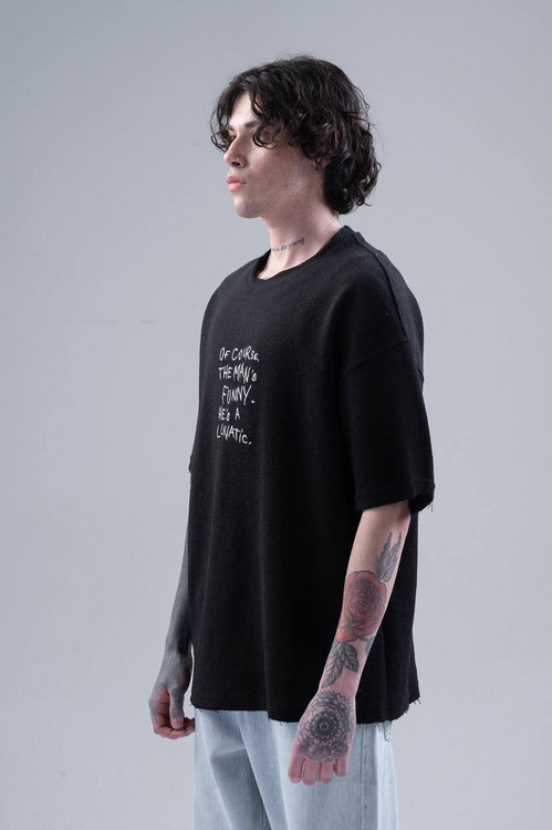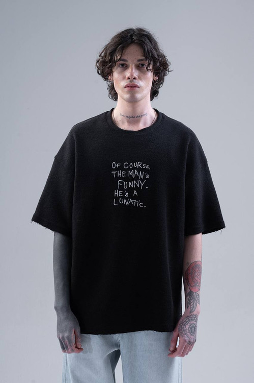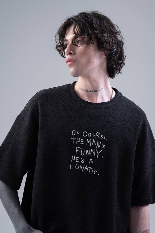 طرح عبارت طنز "OF COURSE, THE MAN's FUNNY. HE'S A L'UNATIC." با تزیینات گلدوزی برای جلوه لوکس و ماندگار.